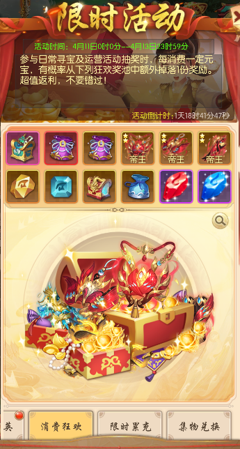 活动期间,参与日常寻宝及运营活动抽奖时,每消费一定元宝,有概率从狂欢奖池中额外获得一份奖励掉落,超值返利,不要错过!