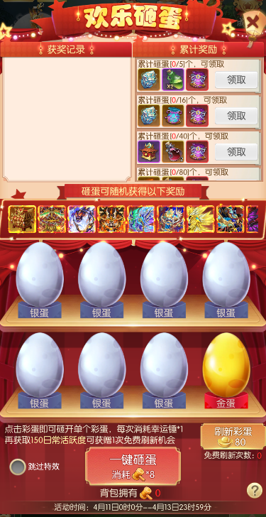欢乐砸蛋,限时夺宝,欢乐升级!少侠可通过砸蛋有机会获得大坐骑【八岐大蛇】、【玉山白麟】、【铁甲熊王】、以及神功化形【北斗天衍诀】、魂灵【将虎魂灵】!此外,累计奖励奖励多多,少侠切勿错过!