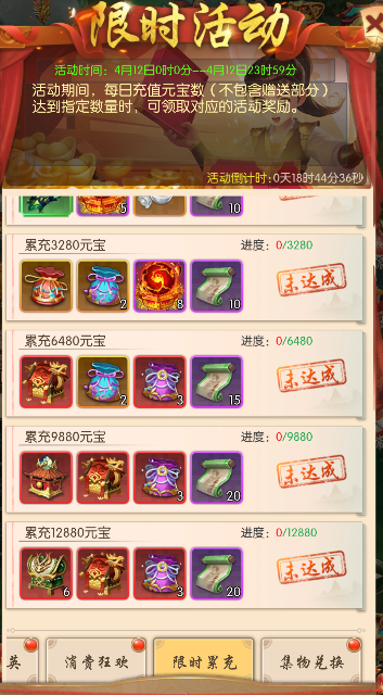 每日累计充值元宝数(不包含赠送部分)达到指定数量时,可领取对应的活动奖励。