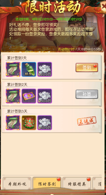 每天首次登录游戏后,即可在活动界面处领取一份登录奖励,登录天数越多奖励越丰厚。