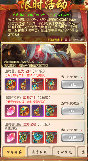 每天14:00和19:00,山海谷各层均会刷新活动精英,挑战可以获得丰厚奖励!