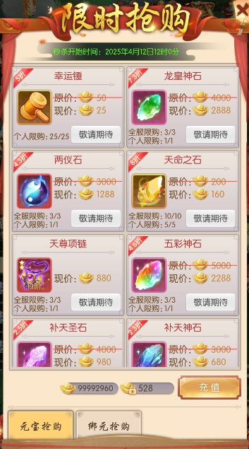 活动期间,可用元宝或绑元限时抢购各种珍贵道具,数量有限,各位少侠千万不要错过!