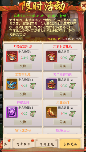 击杀180级以上世界首领、个人首领、炼狱首领、首领之家首领,或180级以上玩家进行离线挂机、在线挂机等均有机会额外获得古画活动道具,可在限时兑换中兑换丰厚奖励。