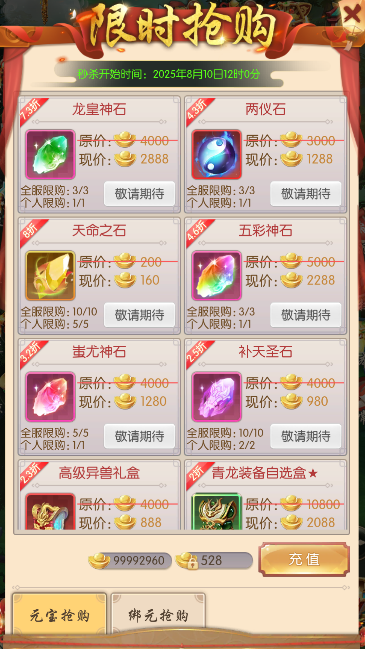 活动期间,可用元宝或绑元限时抢购各种珍贵道具,数量有限,各位少侠千万不要错过!