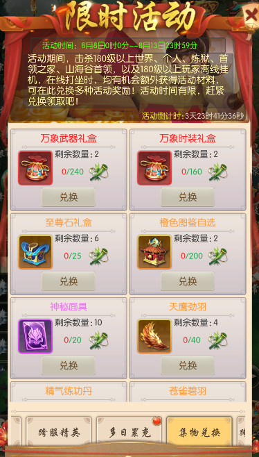 活动期间,使用【笛子】可兑换多种活动奖励道具,数量有限时间有限,赶紧兑换领取吧。
