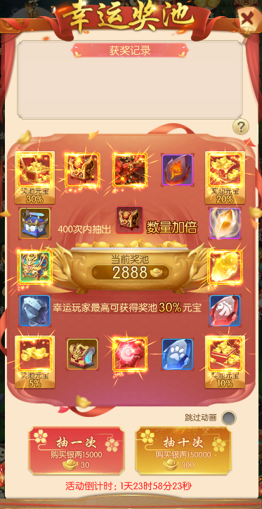 投入元宝进行招财猫祈福,将会获得一定倍数的招财猫奖励,最高可获得3倍奖励;多倍返元宝,稳赚不赔!