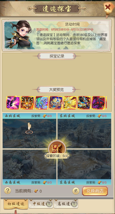 l 遗迹分为初级/中级/高级3个等级,每个等级分为4个区域,点击区域可消耗藏宝图探索遗迹,每次探索都可获得道具奖励;