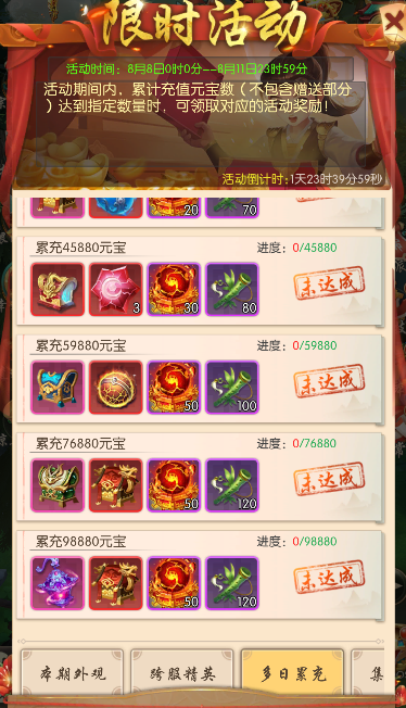 活动期间累计充值元宝数(不包含赠送部分)达到指定数量时,可领取对应的活动奖励: