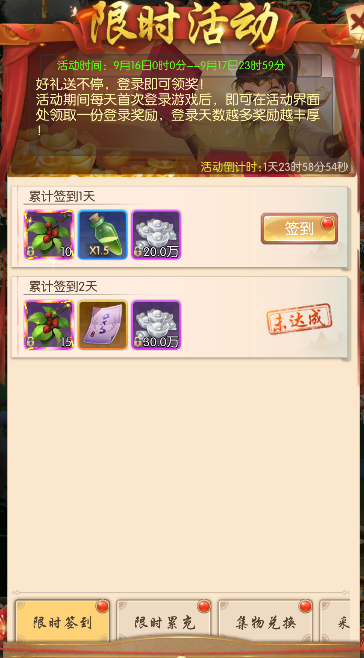 每天首次登录游戏后,即可在活动界面处领取一份登录奖励,登录天数越多奖励越丰厚。