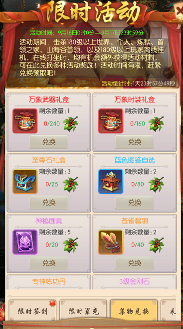 击杀180级以上世界首领、个人首领、炼狱首领、首领之家首领,或180级以上玩家进行离线挂机、在线挂机等均有机会额外获得活动道具【桑叶】,可在限时兑换中兑换丰厚奖励。