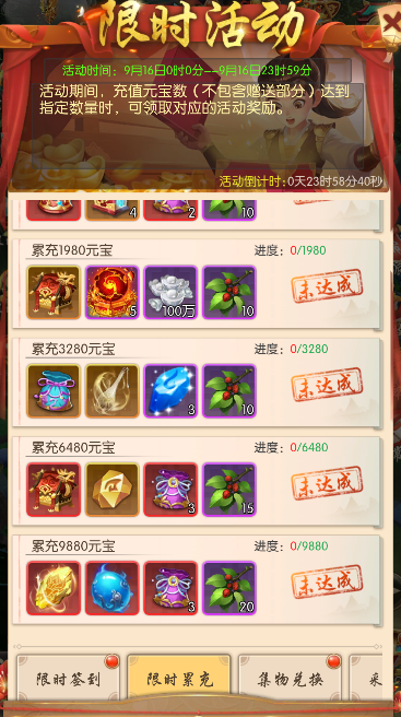 每日累计充值元宝数(不包含赠送部分)达到指定数量时,可领取对应的活动奖励。