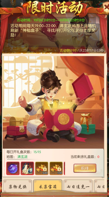 每天19:00-22:00清玄派地图会刷新神秘盒子,寻找并打开神秘盒子可获得丰厚奖励;