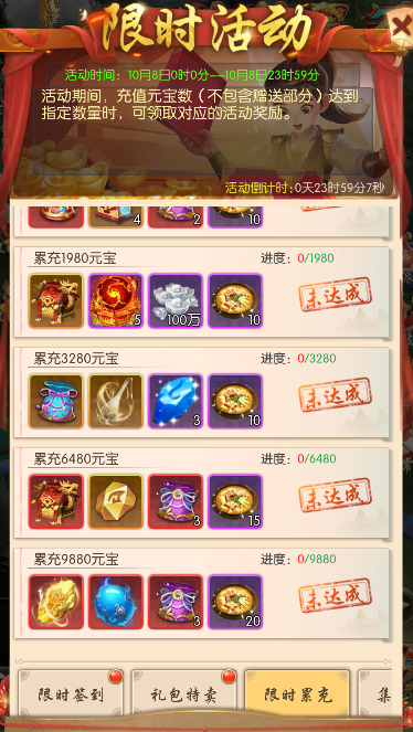 每日累计充值元宝数(不包含赠送部分)达到指定数量时,可领取对应的活动奖励。