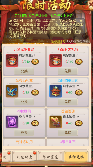击杀180级以上世界首领、个人首领、炼狱首领、首领之家首领,或180级以上玩家进行离线挂机、在线挂机等均有机会额外获得活动道具【大补汤】,可在限时兑换中兑换丰厚奖励。