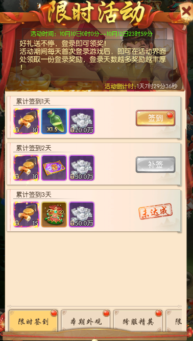 每天首次登录游戏后,即可在活动界面处领取一份登录奖励,登录天数越多奖励越丰厚。