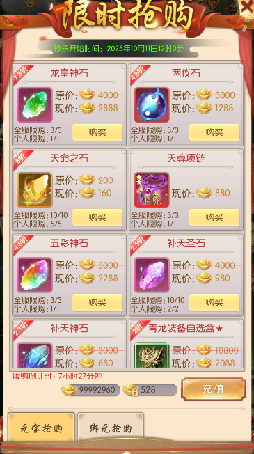 活动期间,可用元宝或绑元限时抢购各种珍贵道具,数量有限,各位少侠千万不要错过!
