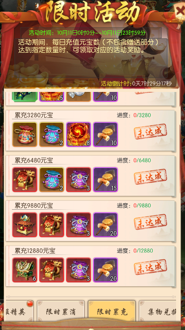 每日累计充值元宝数(不包含赠送部分)达到指定数量时,可领取对应的活动奖励。