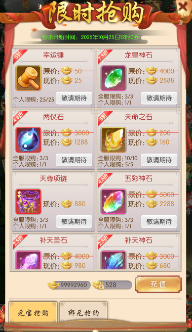 活动期间,可用元宝或绑元限时抢购各种珍贵道具,数量有限,各位少侠千万不要错过!