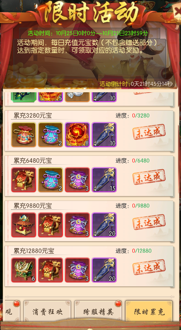 每日累计充值元宝数(不包含赠送部分)达到指定数量时,可领取对应的活动奖励。