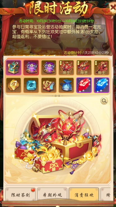 活动期间,参与日常寻宝及运营活动抽奖时,每消费一定元宝,有概率从狂欢奖池中额外获得一份奖励掉落,超值返利,不要错过!