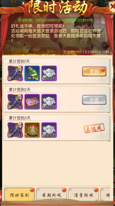 每天首次登录游戏后,即可在活动界面处领取一份登录奖励,登录天数越多奖励越丰厚。