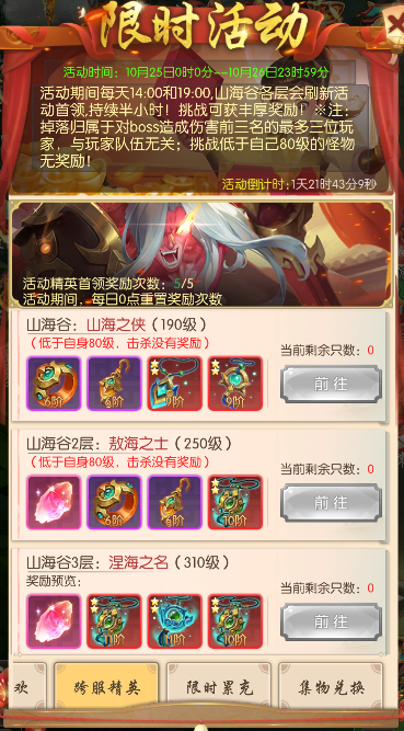 每天14:00和19:00,山海谷各层均会刷新活动精英,挑战可以获得丰厚奖励!