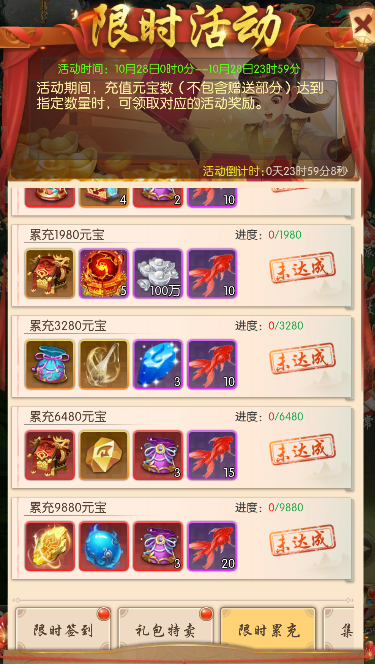 每日累计充值元宝数(不包含赠送部分)达到指定数量时,可领取对应的活动奖励。