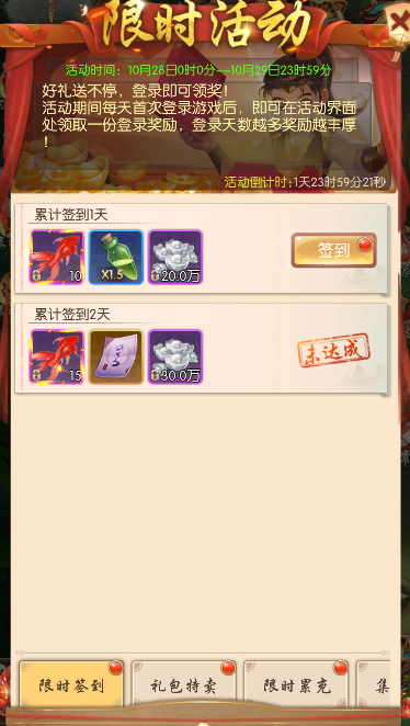每天首次登录游戏后,即可在活动界面处领取一份登录奖励,登录天数越多奖励越丰厚。