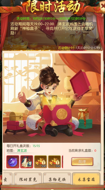 每天19:00-22:00清玄派地图会刷新神秘盒子,寻找并打开神秘盒子可获得丰厚奖励;