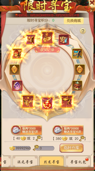 【命格寻宝】、【进阶寻宝】、【点睛寻宝】、【圣器寻宝】、【武魂寻宝】、【混元寻宝】、【灵仪寻宝】六种类型寻宝同时为少侠开启~每进行一次寻宝,可获得积分以及银两奖励,并且从奖池中随机获得道具,寻宝积分可以在兑换商城中兑换神兵化形【阎罗鬼面甲】、两仪石等极品道具!