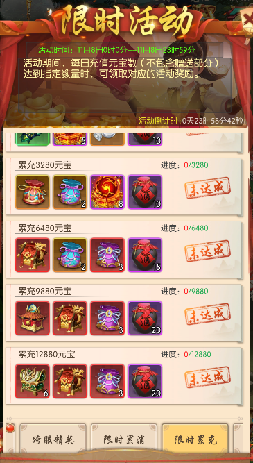 每日累计充值元宝数(不包含赠送部分)达到指定数量时,可领取对应的活动奖励。