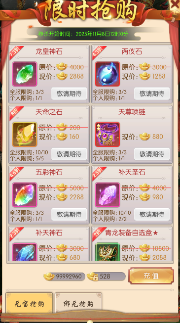 活动期间,可用元宝或绑元限时抢购各种珍贵道具,数量有限,各位少侠千万不要错过!