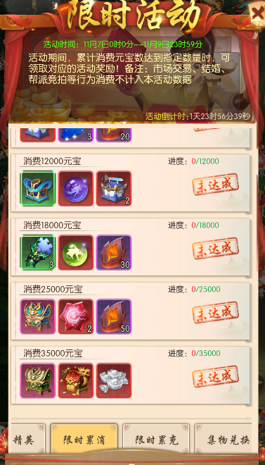 活动期间,累计消费元宝数达到指定数量时,可领取对应的活动奖励!