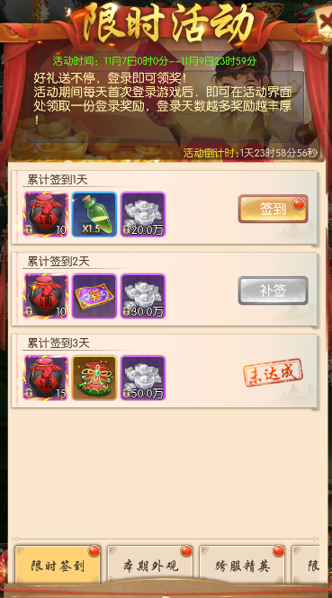 每天首次登录游戏后,即可在活动界面处领取一份登录奖励,登录天数越多奖励越丰厚。