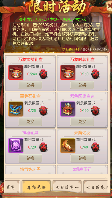 击杀180级以上世界首领、个人首领、炼狱首领、首领之家首领,或180级以上玩家进行离线挂机、在线挂机等均有机会额外获得榴花酿活动道具,可在限时兑换中兑换丰厚奖励。