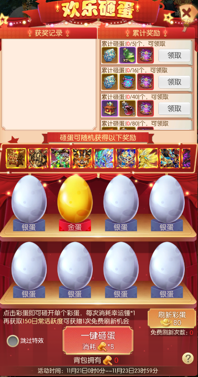 欢乐砸蛋,限时夺宝,欢乐升级!少侠可通过砸蛋有机会获得大坐骑【凌霄飞剑】、【雪地精灵】、【炎狱魔龙】、以及神功化形【奇门锁天术】、魂灵【琅木魂灵】!此外,累计奖励奖励多多,少侠切勿错过!