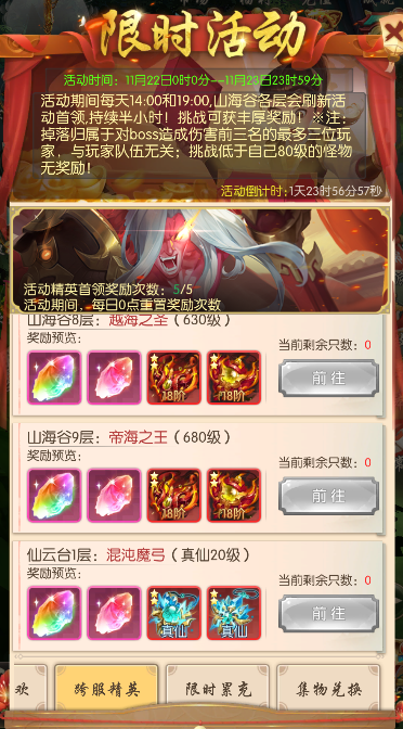 每天14:00和19:00,山海谷各层均会刷新活动精英,挑战可以获得丰厚奖励!
