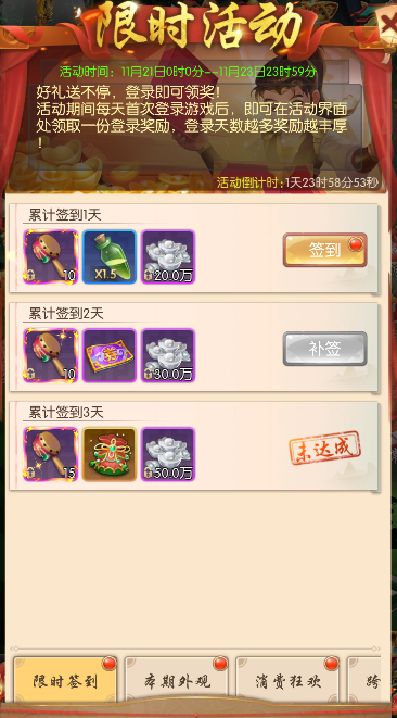 每天首次登录游戏后,即可在活动界面处领取一份登录奖励,登录天数越多奖励越丰厚。