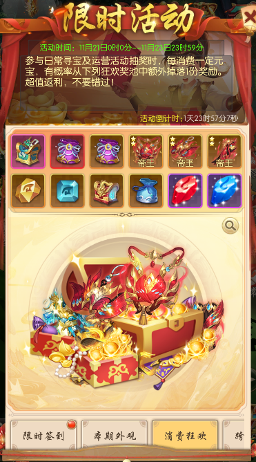 活动期间,参与日常寻宝及运营活动抽奖时,每消费一定元宝,有概率从狂欢奖池中额外获得一份奖励掉落,超值返利,不要错过!