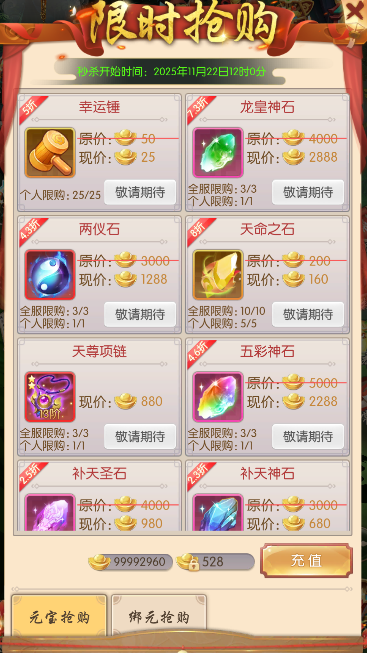 活动期间,可用元宝或绑元限时抢购各种珍贵道具,数量有限,各位少侠千万不要错过!
