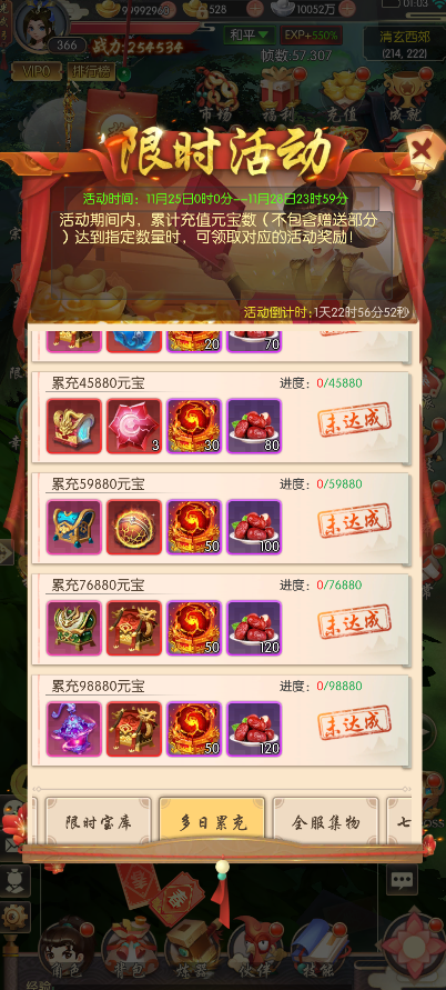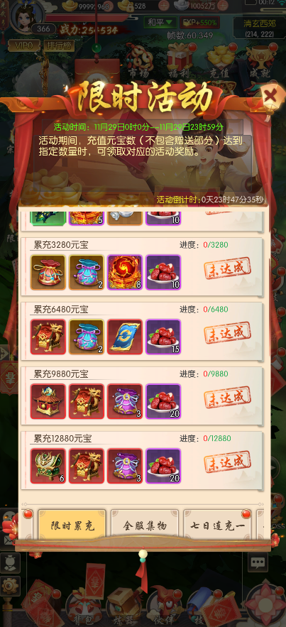 每日累计充值元宝数(不包含赠送部分)达到指定数量时,可领取对应的活动奖励。