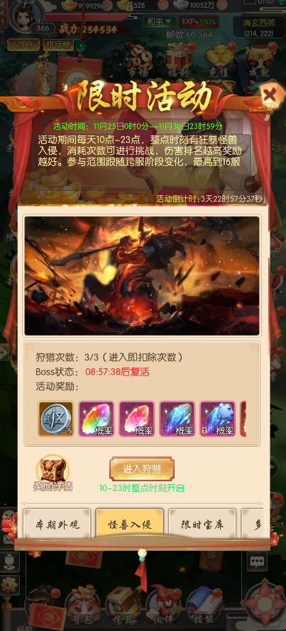 活动期间每天10点-23点,整点时刻有狂暴怪兽入侵,消耗次数可进行挑战,伤害排名越高奖励越好。排名参与范围跟随跨服阶段变化,最高可到16服!