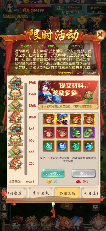 在全服集物处提交【红枣】可抽取随机奖励,个人提交到指定数量时可获得指定奖励,全服提交达到指定数量时可激活全服共享福利!