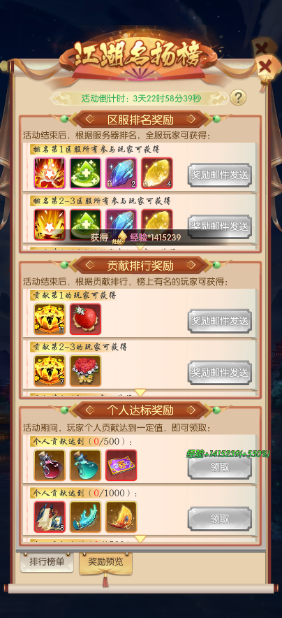 l 共设置有【区服排名奖励】、【贡献排行奖励】、【个人达标奖励】三大奖项;