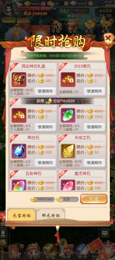 活动期间,可用元宝或绑元限时抢购各种珍贵道具,数量有限,各位少侠千万不要错过!