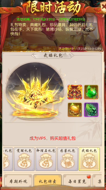 l 仅元宝充值生效,购买礼包或道具不计入,如推送礼包、特惠礼包、聚宝盆等;