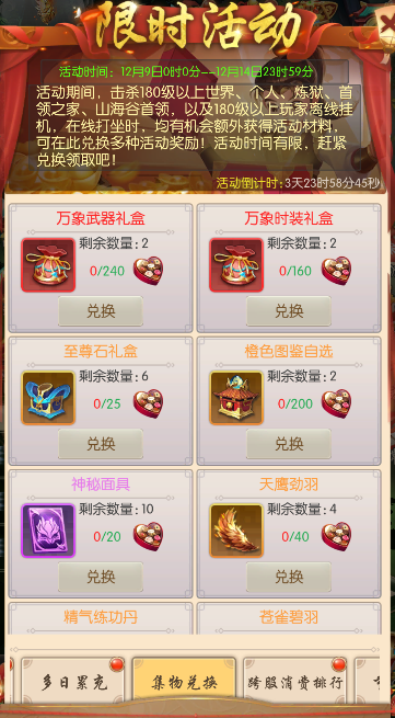 击杀180级以上世界首领、个人首领、炼狱首领、首领之家首领,或180级以上玩家进行离线挂机、在线挂机等均有机会额外获得【甜蜜糖盒】,可在限时兑换中兑换丰厚奖励。