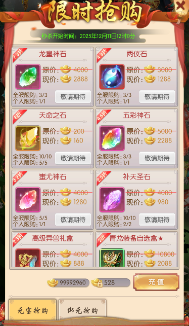活动期间,可用元宝或绑元限时抢购各种珍贵道具,数量有限,各位少侠千万不要错过!