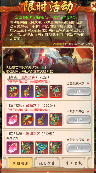 每天14:00和19:00,山海谷各层均会刷新活动精英,挑战可以获得丰厚奖励!