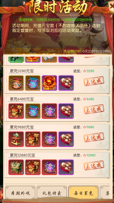 每日累计充值元宝数(不包含赠送部分)达到指定数量时,可领取对应的活动奖励。
